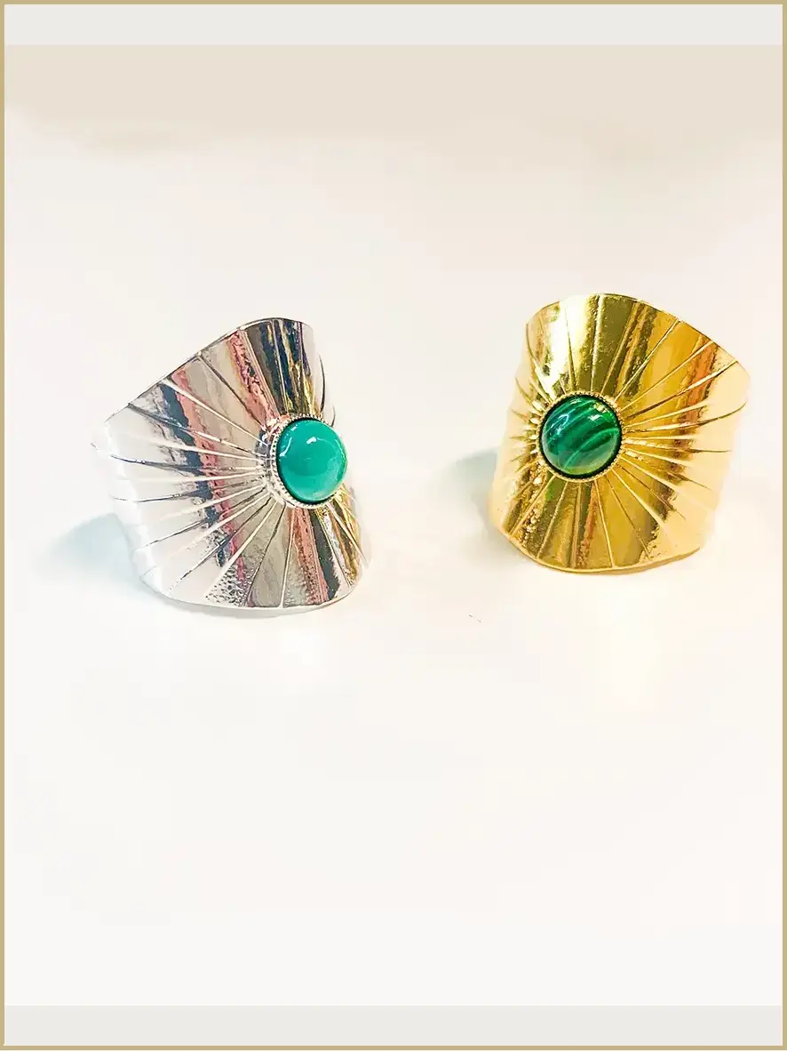 Avec son cabochon en pierre naturelle au centre des rayons du soleil gravés, l’effet de cette bague aura un effet différent selon la couleur de la pierre et le métal doré à l’or fin ou argenté
