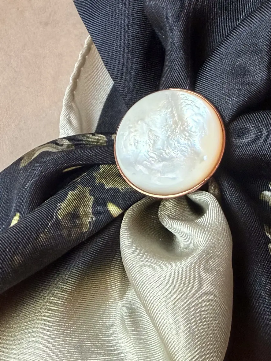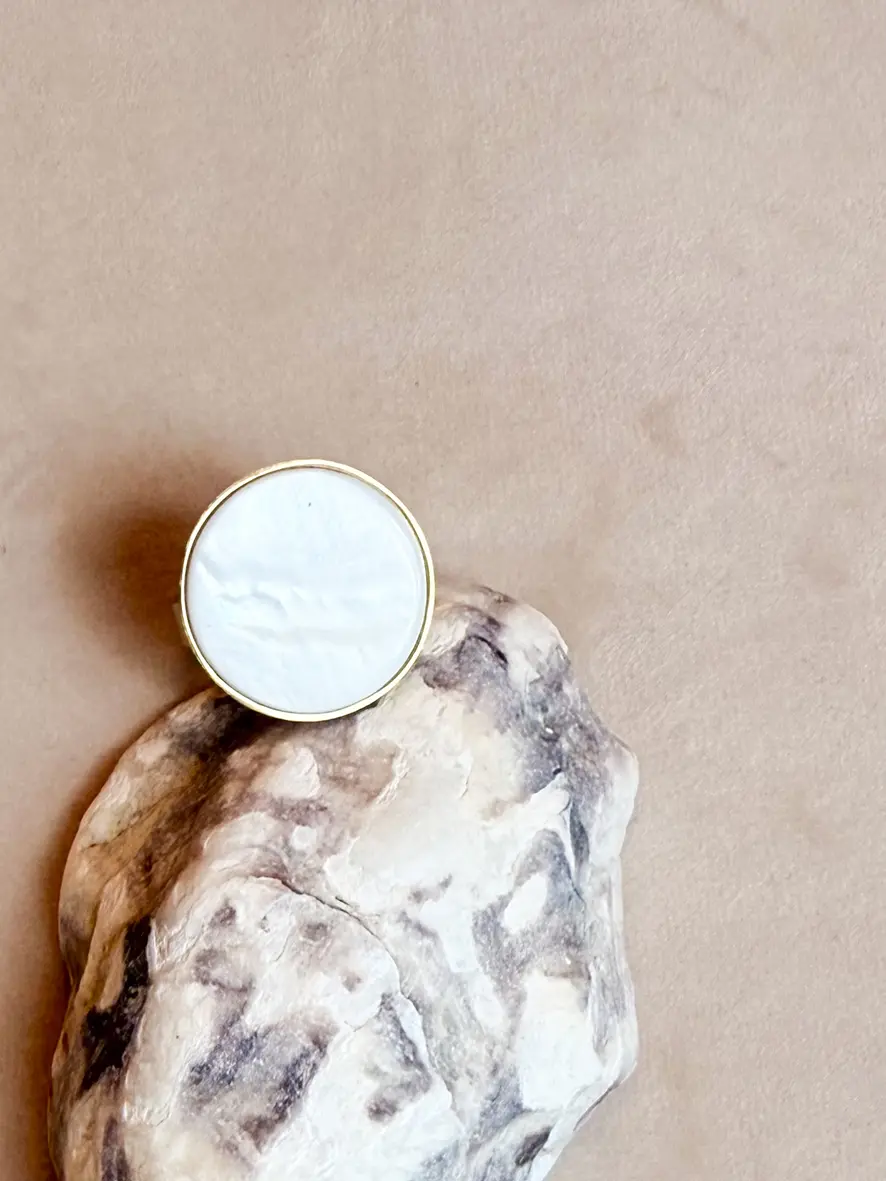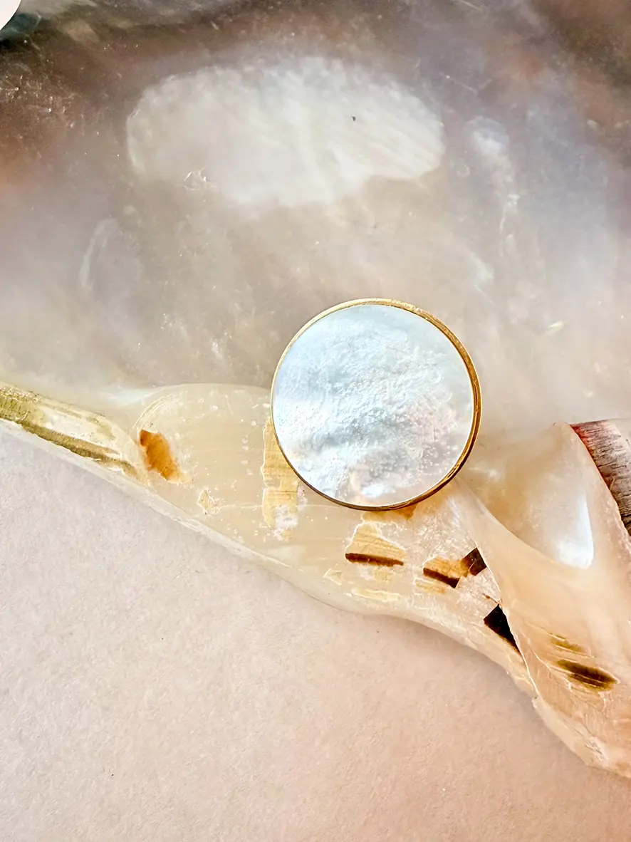 Cette bague se distingue par son grand disque de nacre, légèrement bombé, qui habille la main à lui seul avec élégance.
