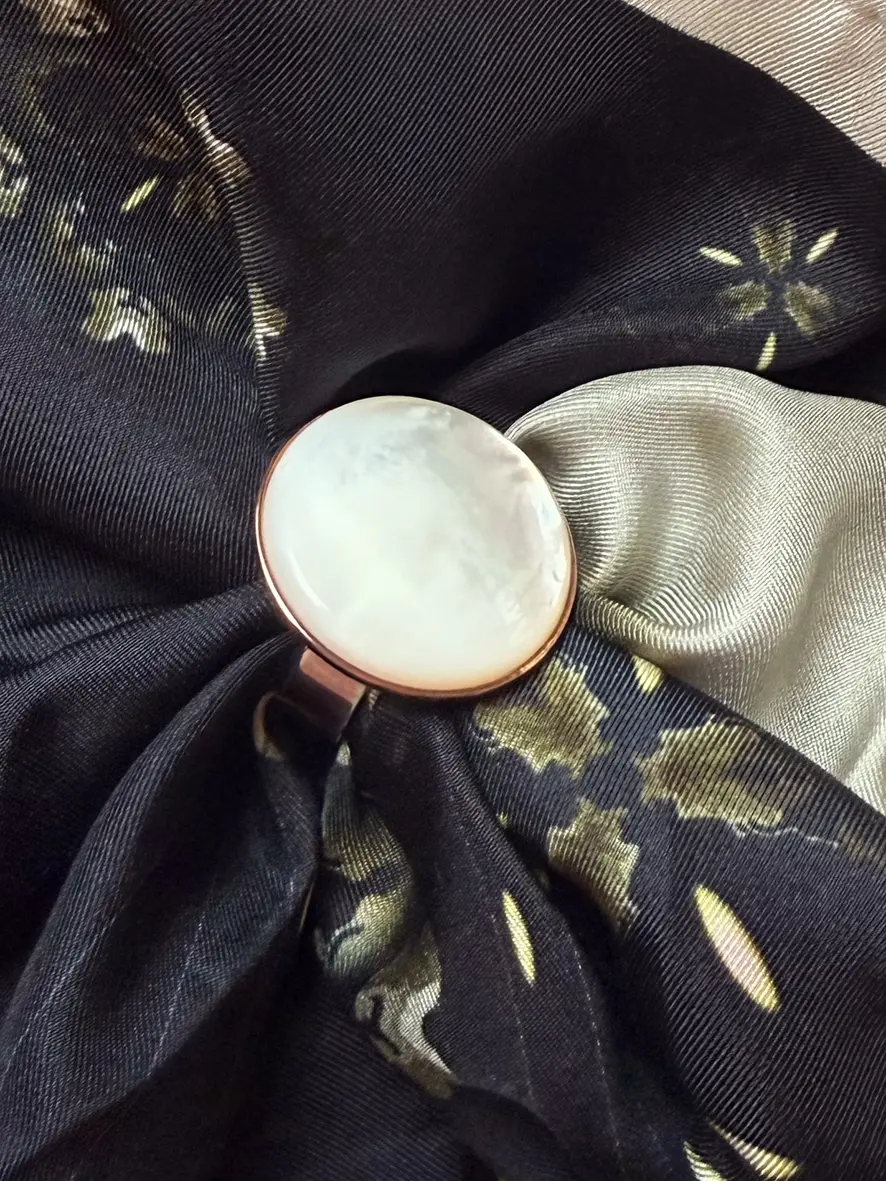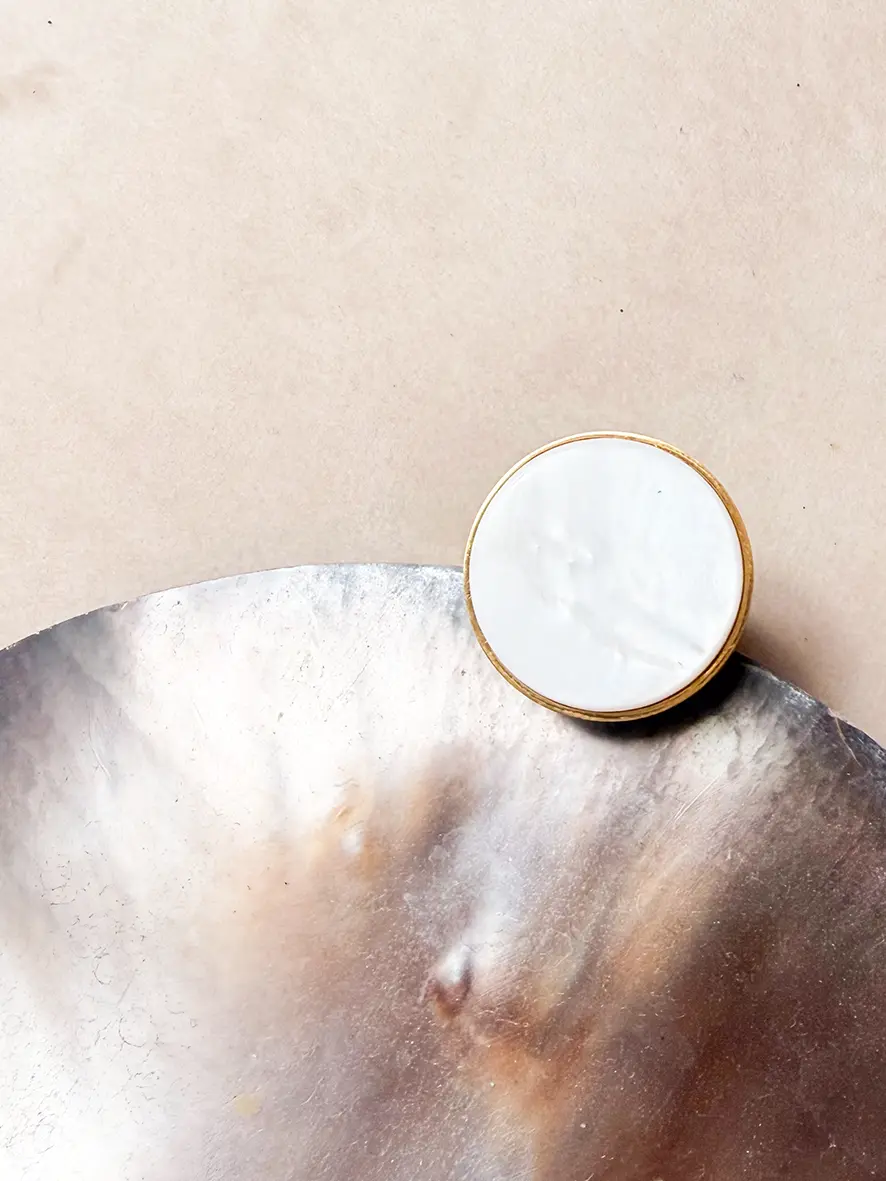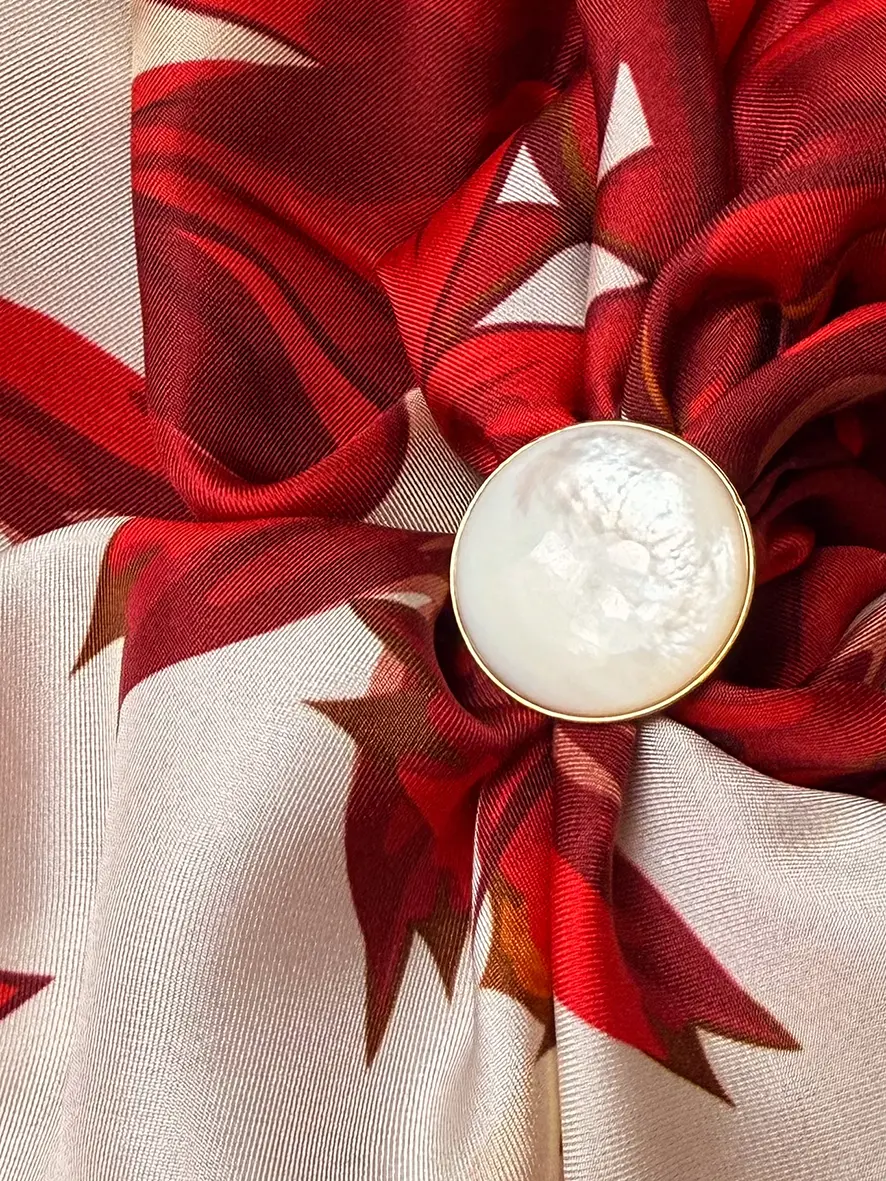 Cette bague se distingue par son grand disque de nacre, légèrement bombé, qui habille la main à lui seul avec élégance.