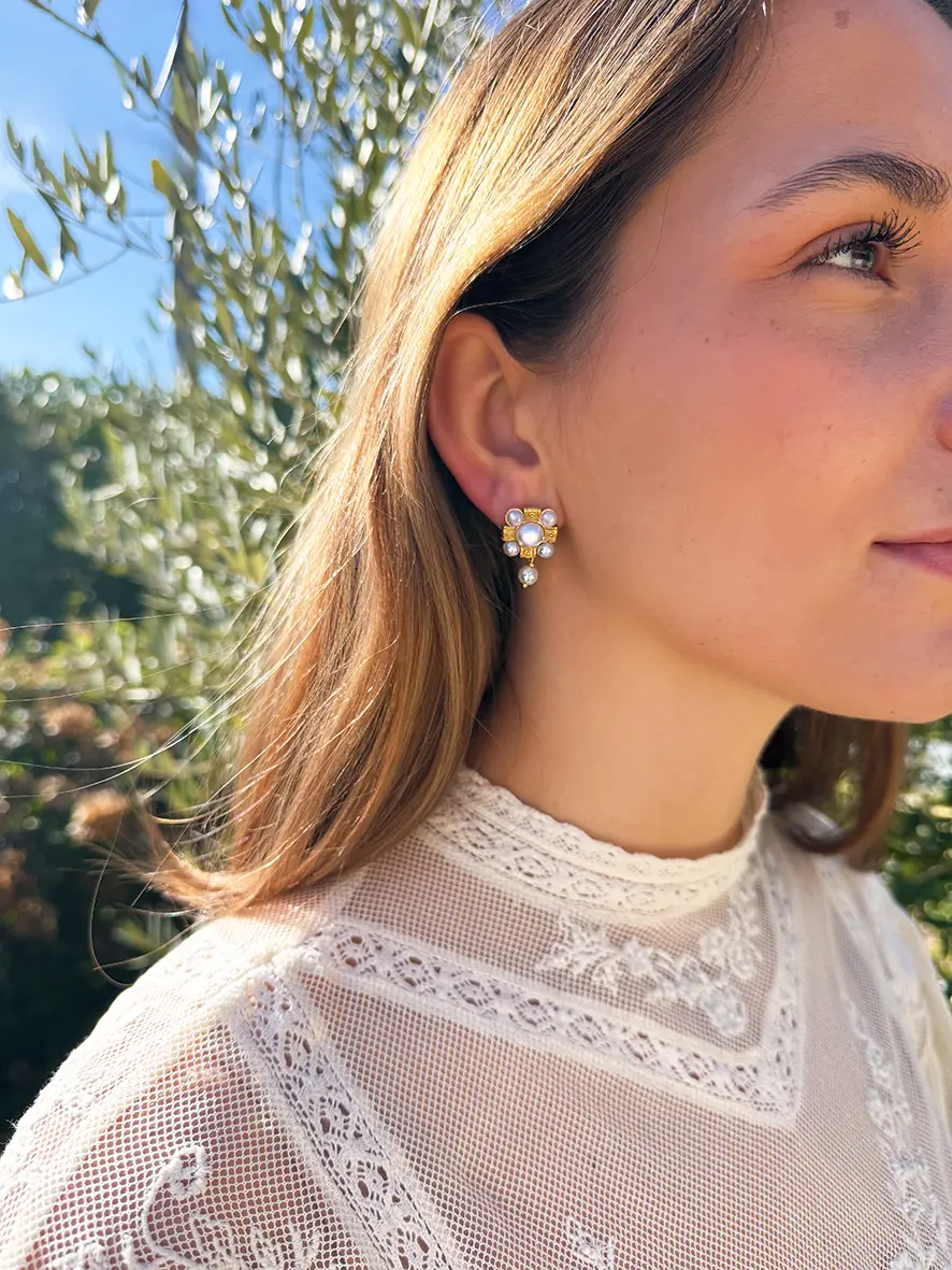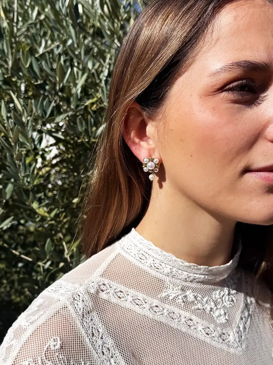 Composition : puce d’oreille en acier inoxydable doré avec perles nacrées incrustrées et petit pendentif avec une perle ronde nacrée