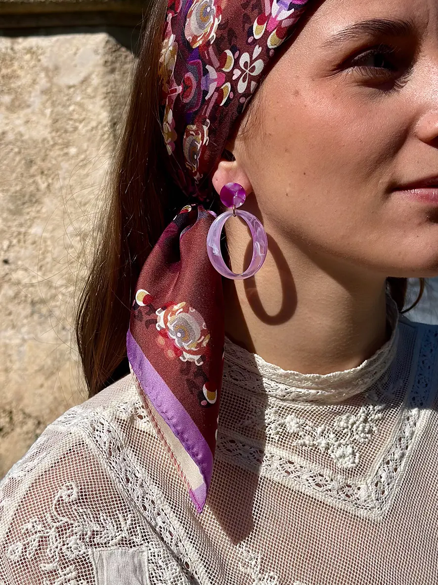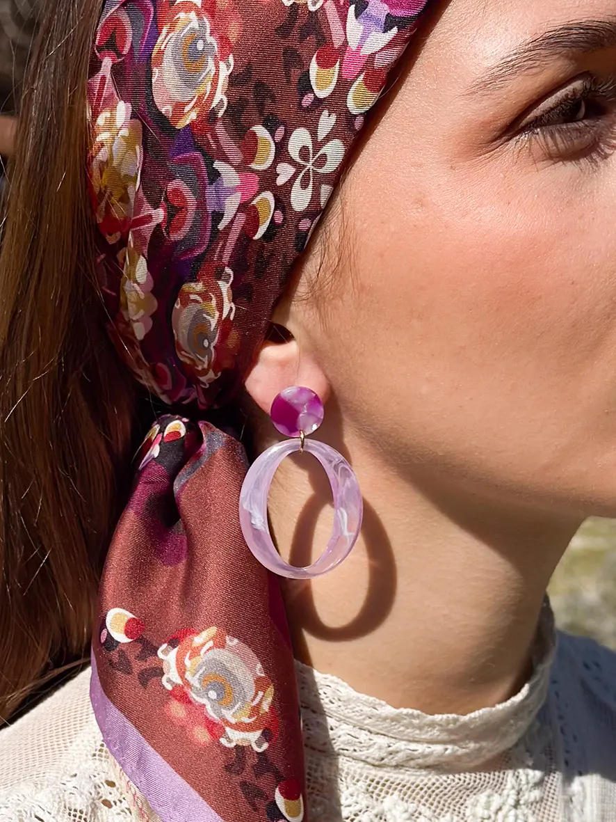 Le pendentif ovale est réalisé en acétate marbré lavande, une matière que j’aime utiliser pour sa légèreté et son éclat. Le résultat : une boucle généreuse en volume, mais très confortable à porter tout au long de la journée.