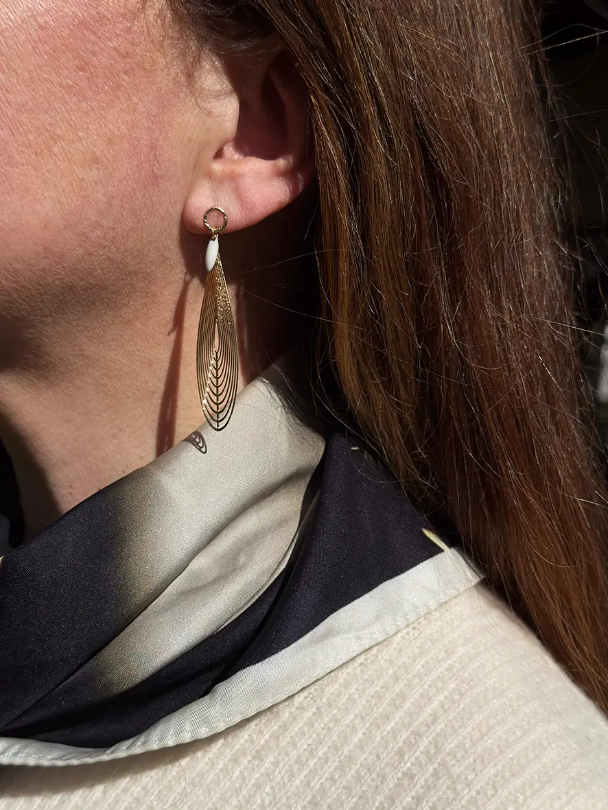 Légères comme une plume… Complétez votre look avec cette paire de boucles d’oreilles avec leur pendentif en forme de plume en estampe et les clous d’oreille en cercle ajouré.
