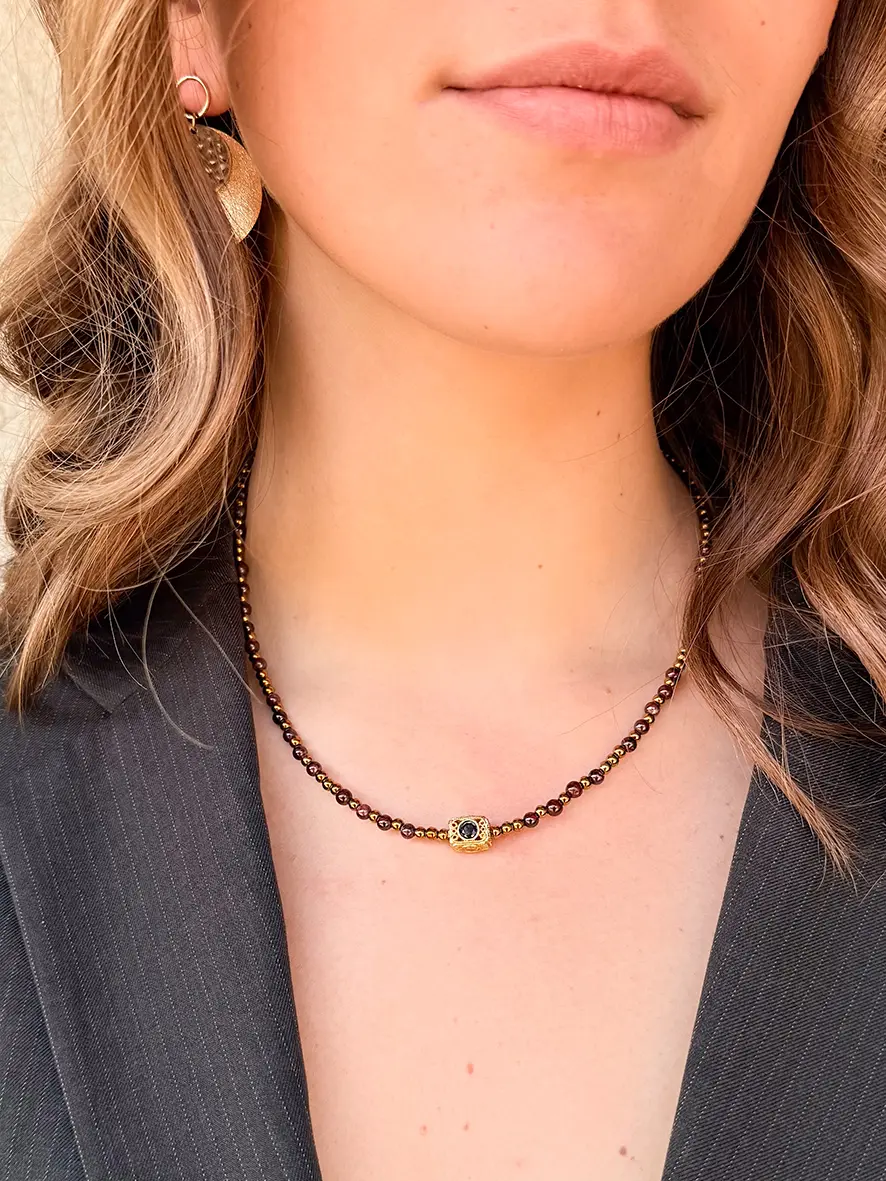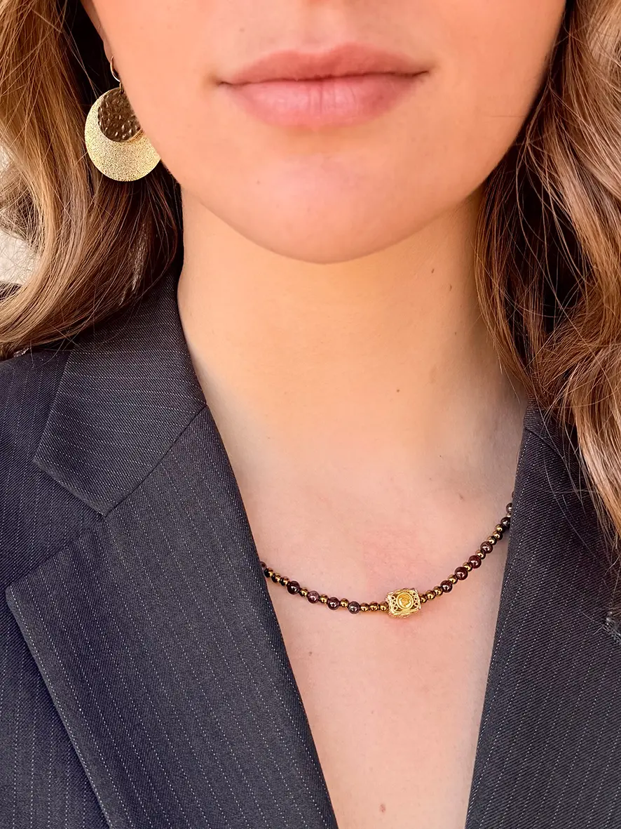 Avec sa pierre naturelle de grenat rouge sombre, ce collier est réputé pour sa symbolique de passion et sa capacité à stimuler l’énergie vitale.
