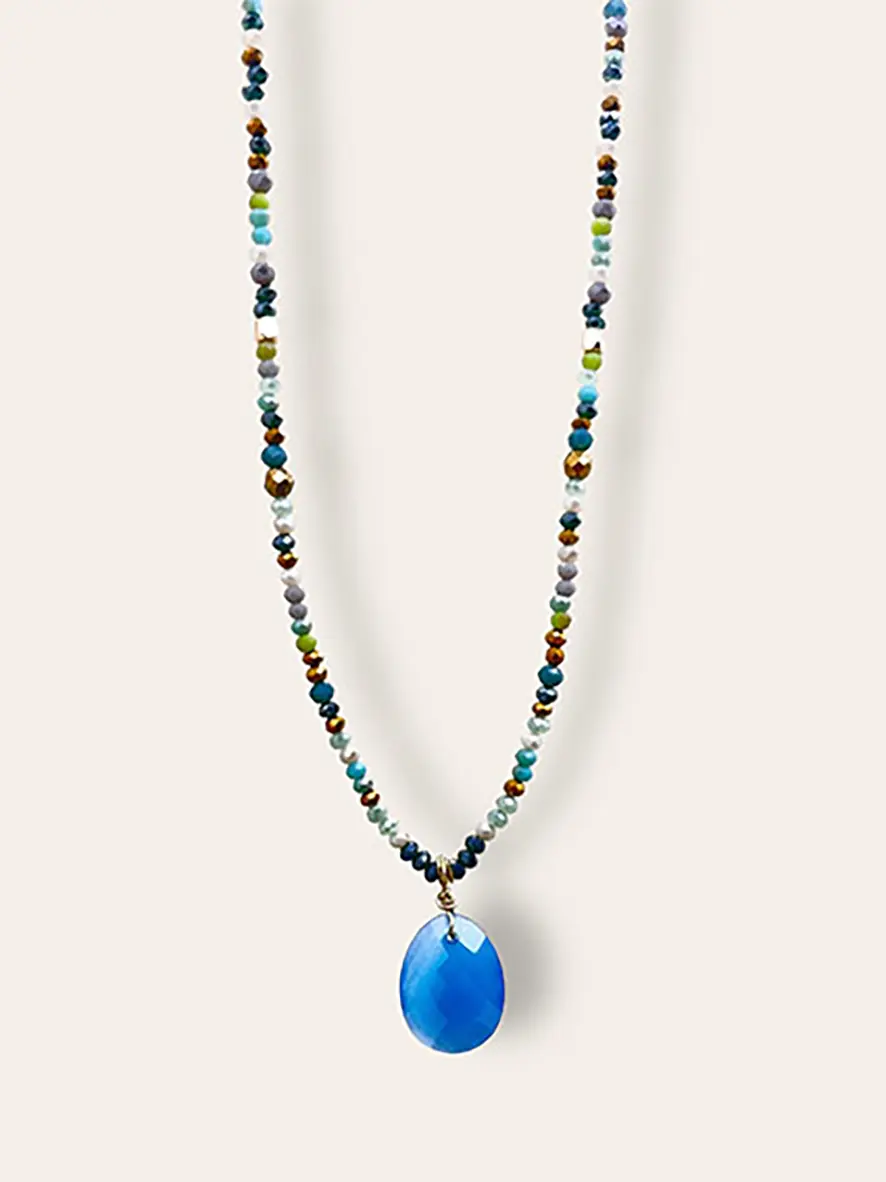 Si vous aimez les couleurs de l’océan avec toutes ses nuances de bleu, vous serez sans doute séduite par ce collier composé de diverses perles fines en verre.